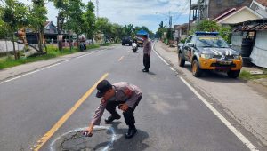 Cegah Laka Lantas, Polres Nganjuk Tandai Jalan Berlubang di Wilayahnya dengan Cat Putih