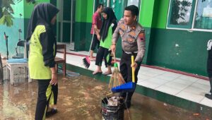 Satlantas Polres Kudus Gelar Bakti Sosial, Bersihkan Lumpur di SMK NU Ma’arif 3 Kudus
