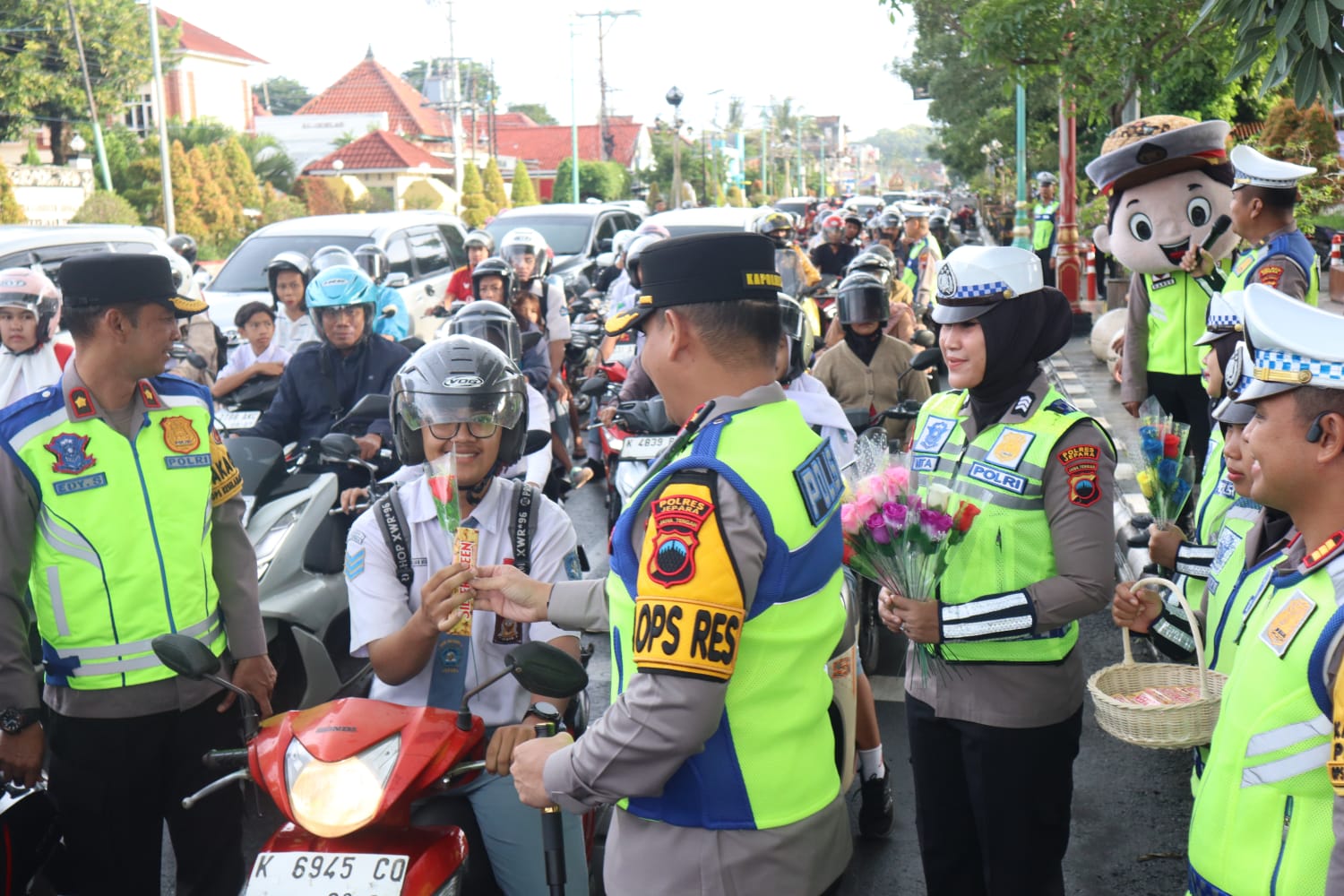 INLINK, Jepara | Kepolisian Resor (Polres) Jepara membagikan cokelat dan bunga kepada pengendara kendaraan di jalan raya yang mentaati aturan lalu lintas, pada Selasa (11/2/2025).