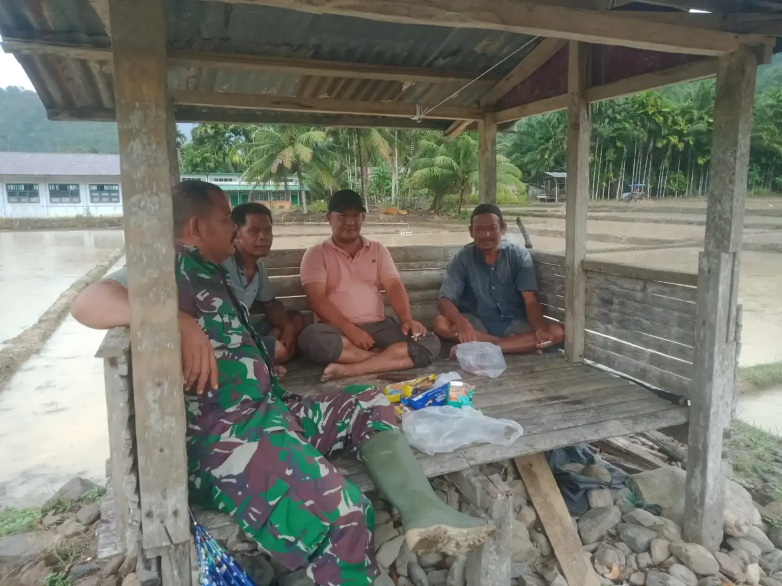 ACEH SELATAN, Inlink.id – Sebagai wujud komitmen TNI dalam mendukung program ketahanan pangan nasional, Babinsa Koramil 11/Kluet Tengah Koptu Ali melaksanakan kegiatan diskusi bersama para petani di pondok sawah bertempat di Desa Mersak Kecamatan Kluet Tengah, Kabupaten Aceh Selatan, Minggu (13/7/2025).