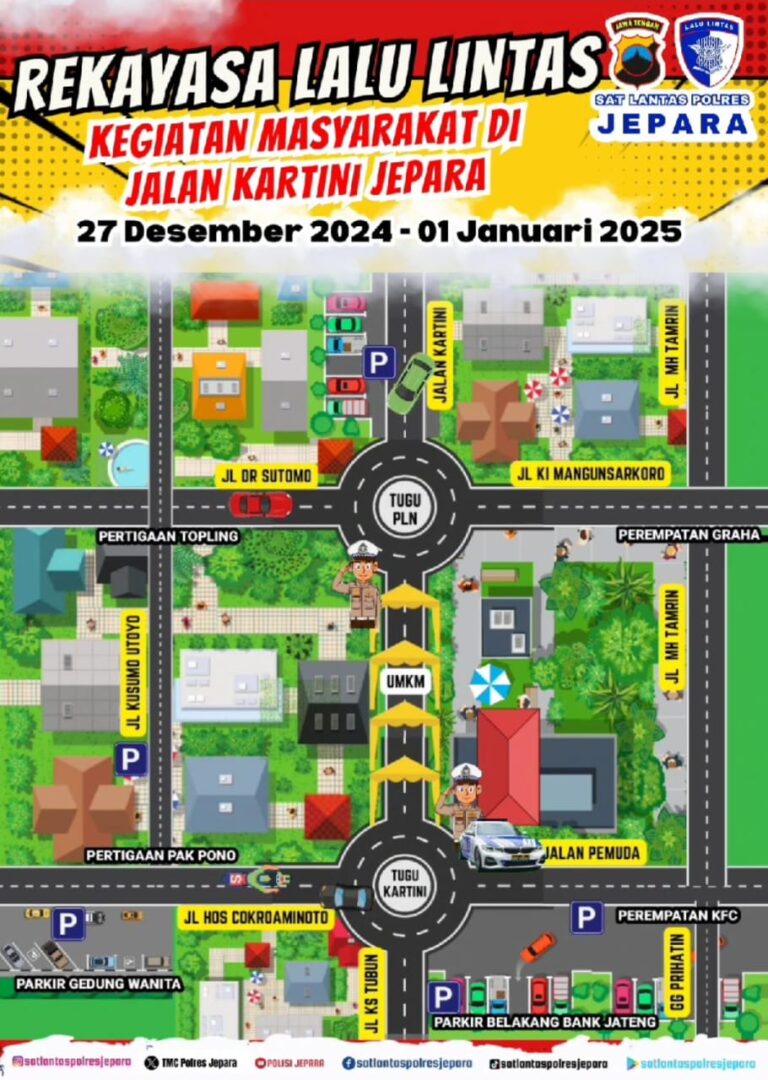 INLINK, Jepara – Polres Jepara | Dengan adanya Expo UMKM Natal dan Tahun Baru (Nataru) 2025, Kepolisian Resor (Polres) Jepara melalui Satuan Lalu Lintas melakukan rekayasa lalu lintas di sepanjang Tugu PLN hingga Tugu Kartini. Pemberlakukan rekayasa arus lalu lintas di mulai dari tanggal 27 November 2024 – 2 Januari 2025. Saat dikonfirmasi, Kapolres Jepara […]