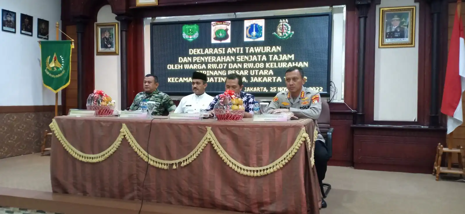 Penyampaian Kapolres Metro Jakarta timur, Semenjak saya berdinas di Polres Metro Jakarta timur saya sering mendengar warga RW.07 & RW.08 sering terjadi tawuran, hari ini kita deklarasikan Anti Tawuran dan setelah deklarasi ini saya bersama FORKOPIMKO tidak mau lagi mendengar ada tawuran dan kalau terjadi akan kami proses sesuai hukum yang berlaku.