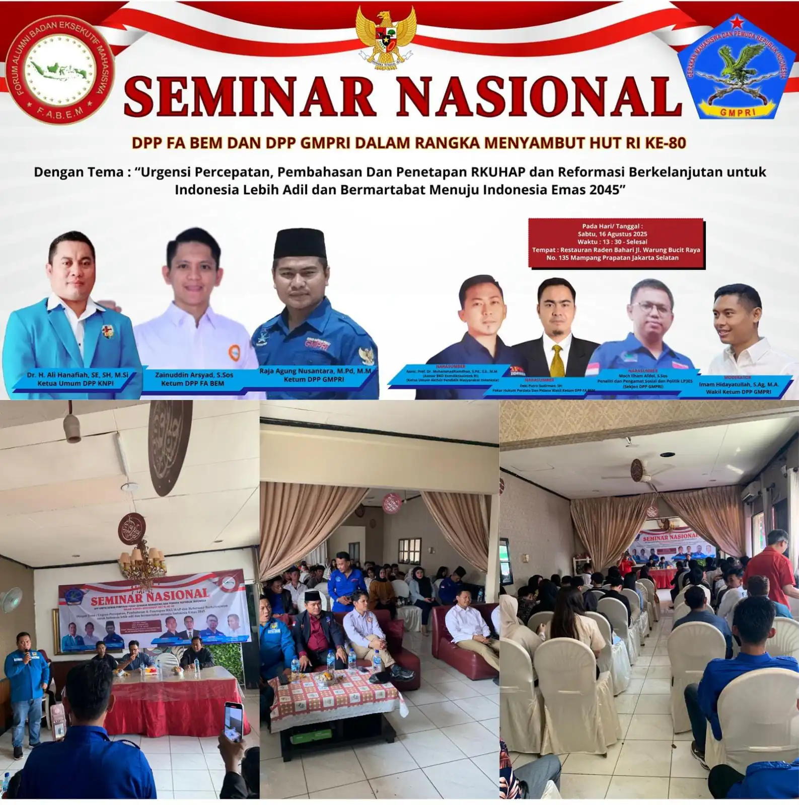 Jakarta, Inlink.id – Dalam rangka menyambut HUT RI Ke-80. Dewan Pimpinan Pusat Forum Alumni Badan Eksekutif Mahasiswa (DPP FA BEM) dan Gerakan Mahasiswa Peduli Rakyat Indonesia (GMPRI) menyelenggarakan Seminar Nasional dengan tema “Urgensi Percepatan Pembahasan RKUHAP dan Reformasi Berkelanjutan untuk Indonesia lebih Adil dan Bermartabat menuju Indonesia Emas 2045”. (16/8).