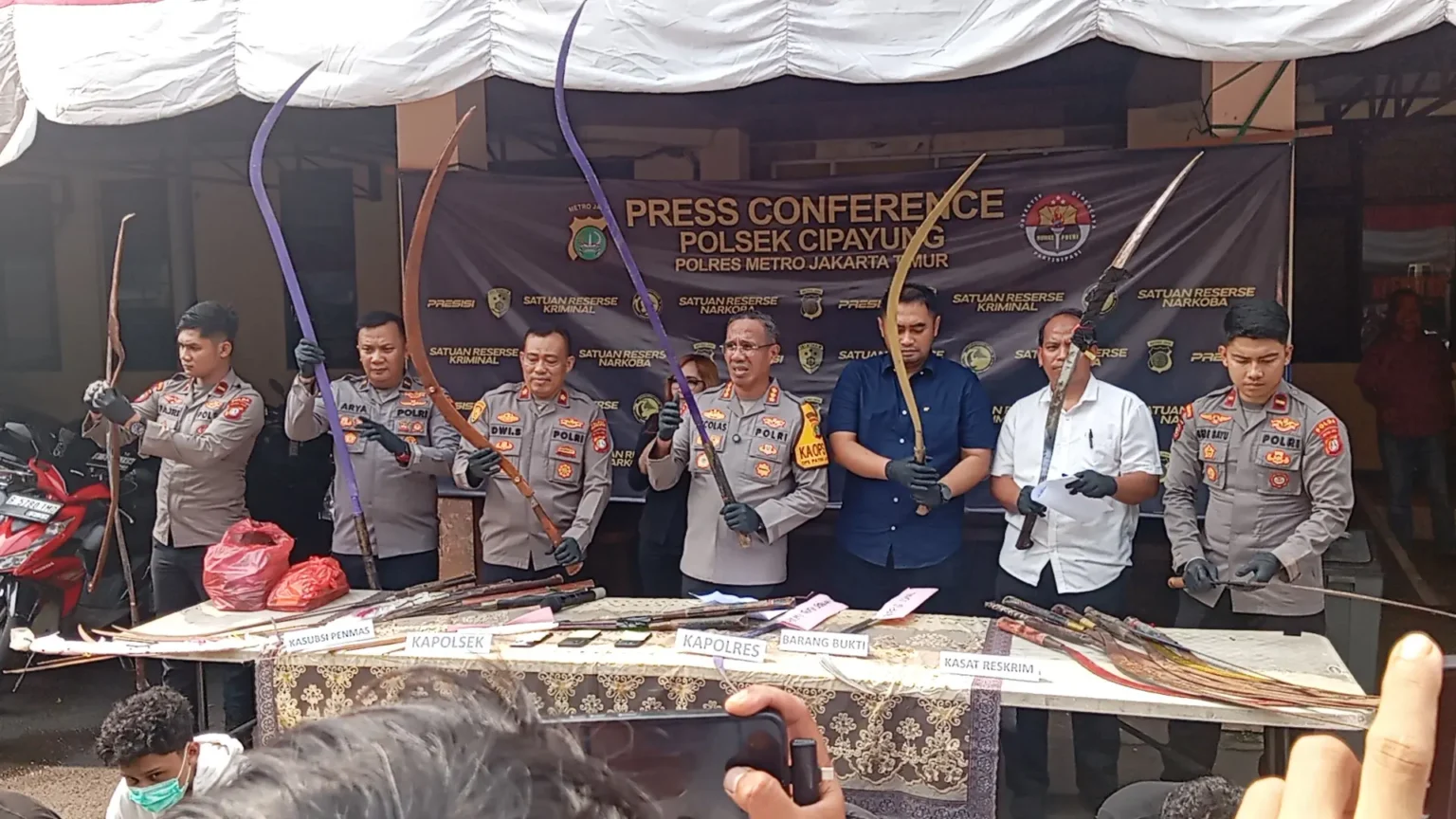 Kami melakukan penangkapan terhadap 36 orang yang sisanya melarikan diri dan kami melakukan penggeledahan ternyata di dalam mobil terdapat 27 senjata tajam jenis corbet dan celurit, ditambah lagi ada juga handphone, ada juga mobil dua jenis dan sepeda motor sebanyak 60 unit” ujar Kapolres Metro Jakarta Timur, Kombes Pol Nicolas Ary Lilipaly saat konferensi pers di Mapolsek Cipayung, Jakarta Timur, Kamis, (17/07/2025).