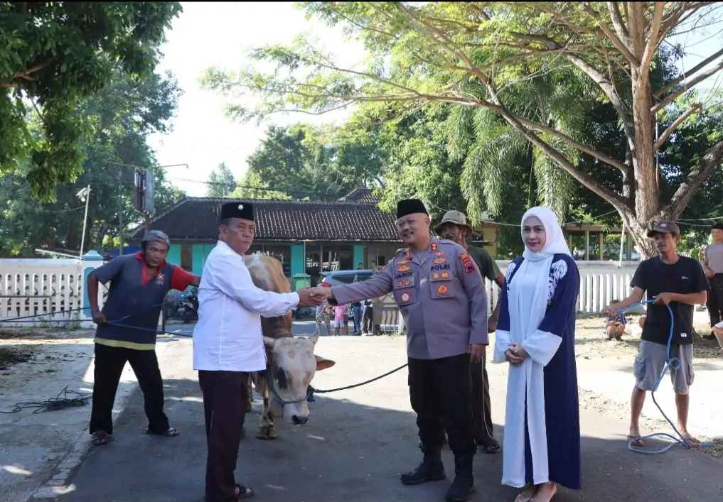 INLINK, Wonogiri | Hari Raya Idul Adha 1446 Hijriyah, Kapolres Wonogiri Kapolres Wonogiri AKBP Jarot Sungkowo, S.H., S.I.K., M.H., serahkan hewan qurban dari Polres Wonogiri kepada takmir masjid Al Mukmin Polres Wonogiri. Sabtu (7/6/2025).