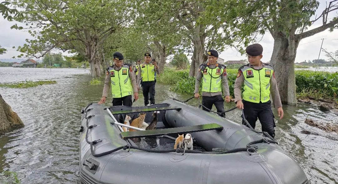 Kasat Samapta AKP Noor Alifi bersama sejumlah personel kemudian menerjang banjir menggunakan perahu dan berhasil mengevakuasi tujuh ekor kucing milik Mbah Narti dalam kondisi selamat.