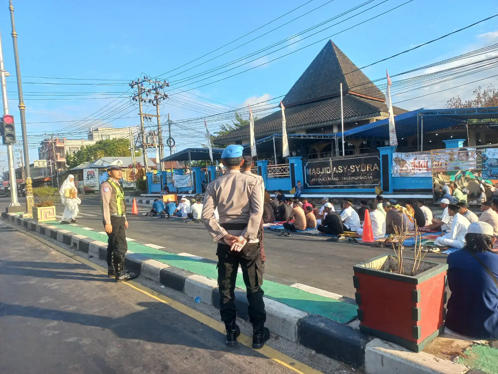 Selain pengamanan, personel juga melaksanakan pengaturan arus lalu lintas dan penataan parkir kendaraan jamaah guna menghindari kemacetan dan potensi gangguan kamtibmas.