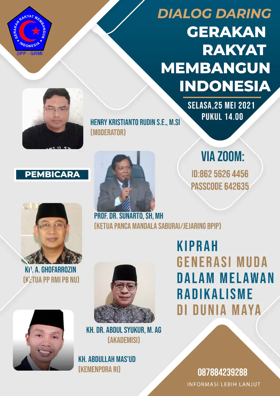 DPD Gerakan Rakyat Membangun Indonesia (GRMI) menyelenggarakan webinar dengan tema “Kiprah Generasi Muda Dalam Melawan Radikalisme Di Dunia Maya” pada Selasa (25/05) di Jakarta Selatan.