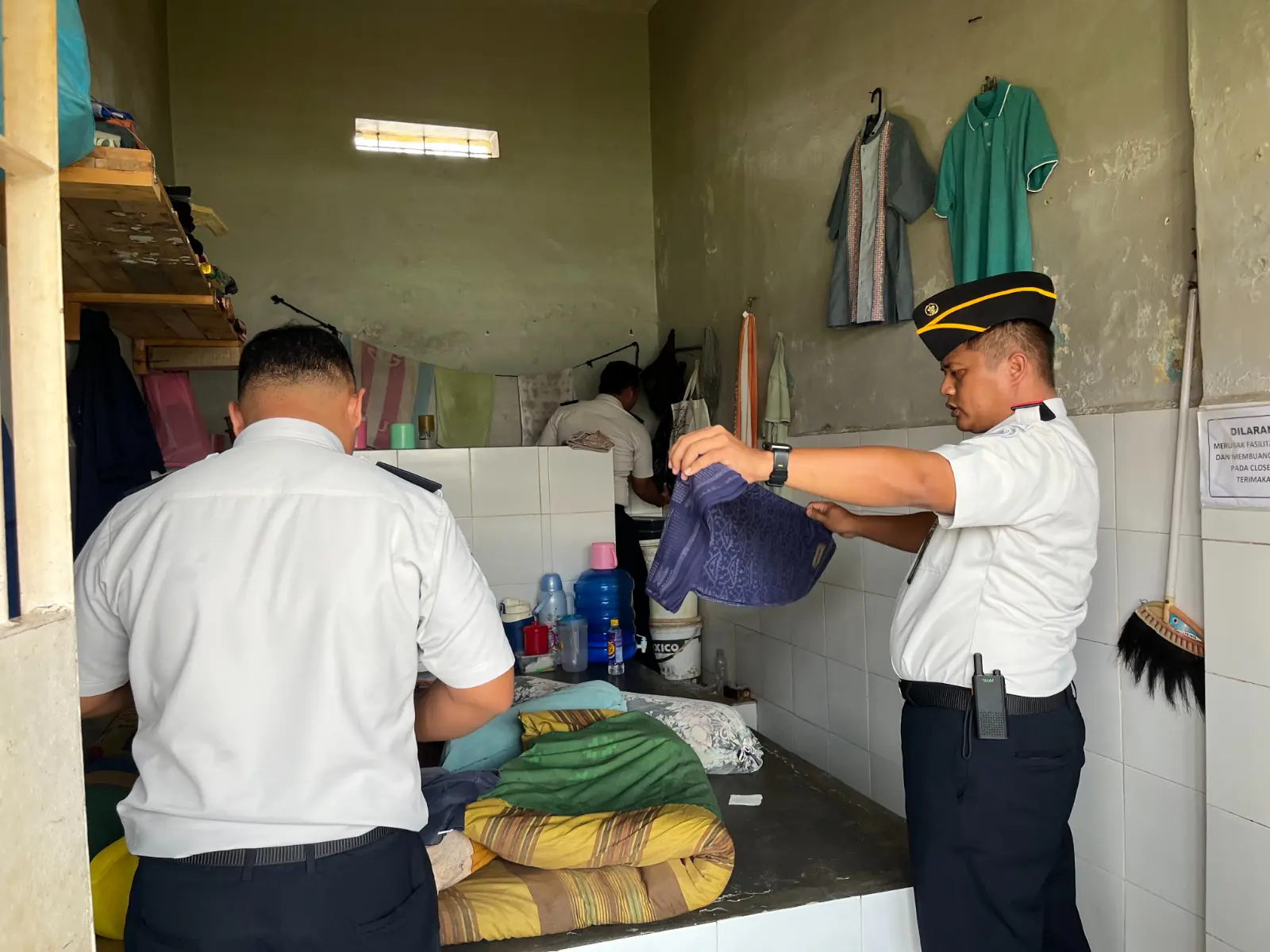 Usai apel, petugas gabungan langsung bergerak menuju blok hunian warga binaan. Satu per satu kamar diperiksa dengan teliti. Petugas menyisir setiap sudut ruangan—mulai dari ventilasi, kolong tempat tidur, hingga tumpukan pakaian—guna memastikan tidak ada barang terlarang yang masuk ke dalam Lapas.