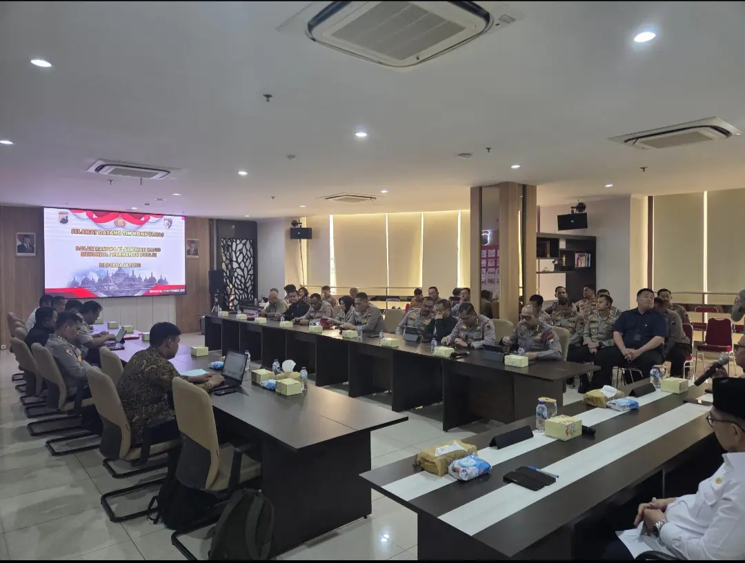 INLINK, Kota Semarang | Kepolisian Daerah Jawa Tengah (Polda Jateng) menerima kunjungan Tim Komisi Kepolisian Nasional (Kompolnas) yang dipimpin Komisioner Yusuf Warsyim pada Selasa (16/9/2025) siang. Rombongan diterima langsung oleh para Pejabat Utama (PJU) Polda Jateng dalam sebuah pertemuan di Aula lantai 6 Mapolda Jateng.