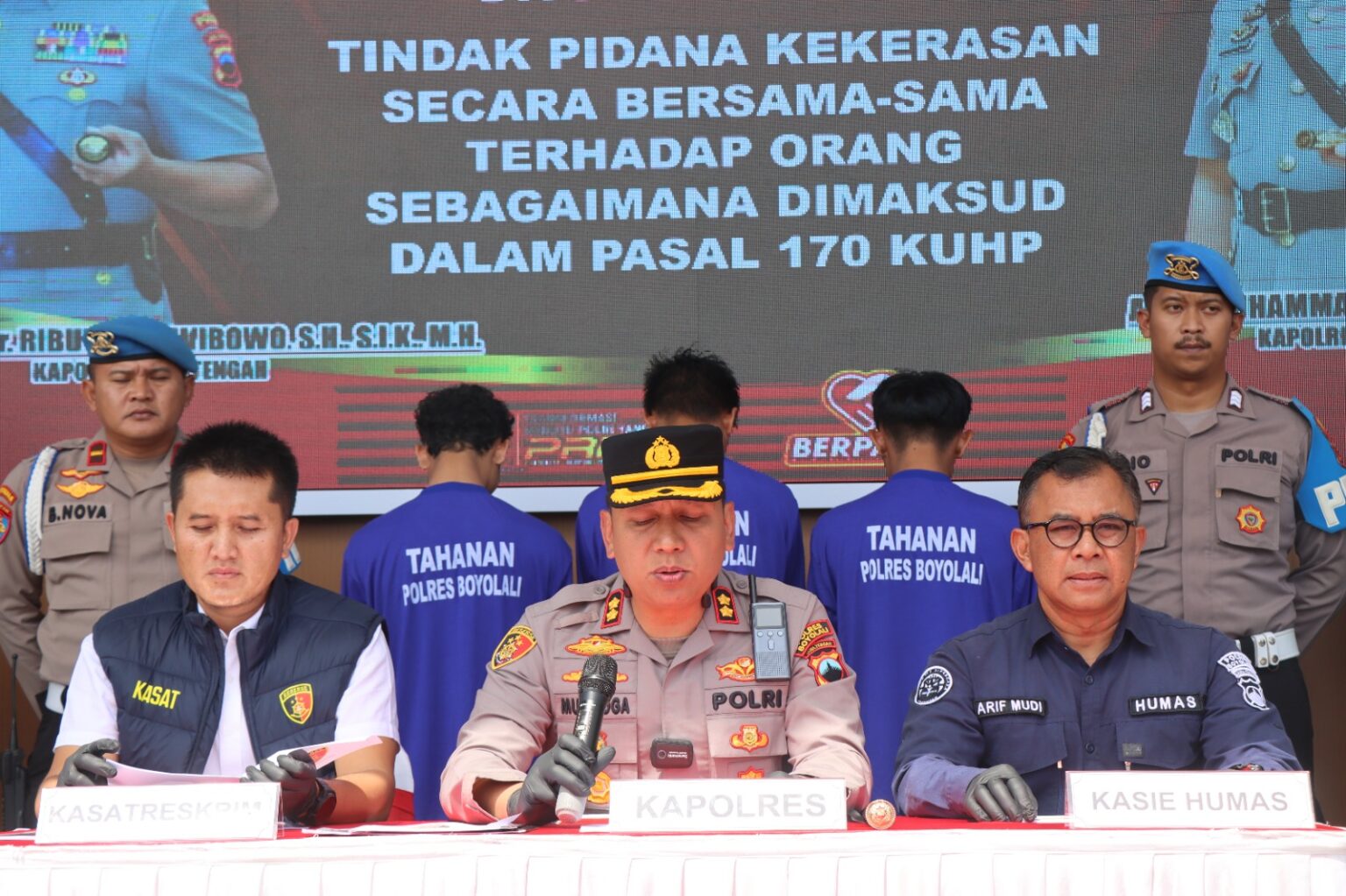 Kapolres Boyolali AKBP Muhammad Yoga dalam kesempatan tersebut menyampaikan “penanganan perkara kasus tindak pidana diduga kekerasan secara bersama-sama yang sempat viral di grup facebook mulai senin malam hingga selasa siang dan mendapatkan banyak komentar dari kalangan masyarakat.