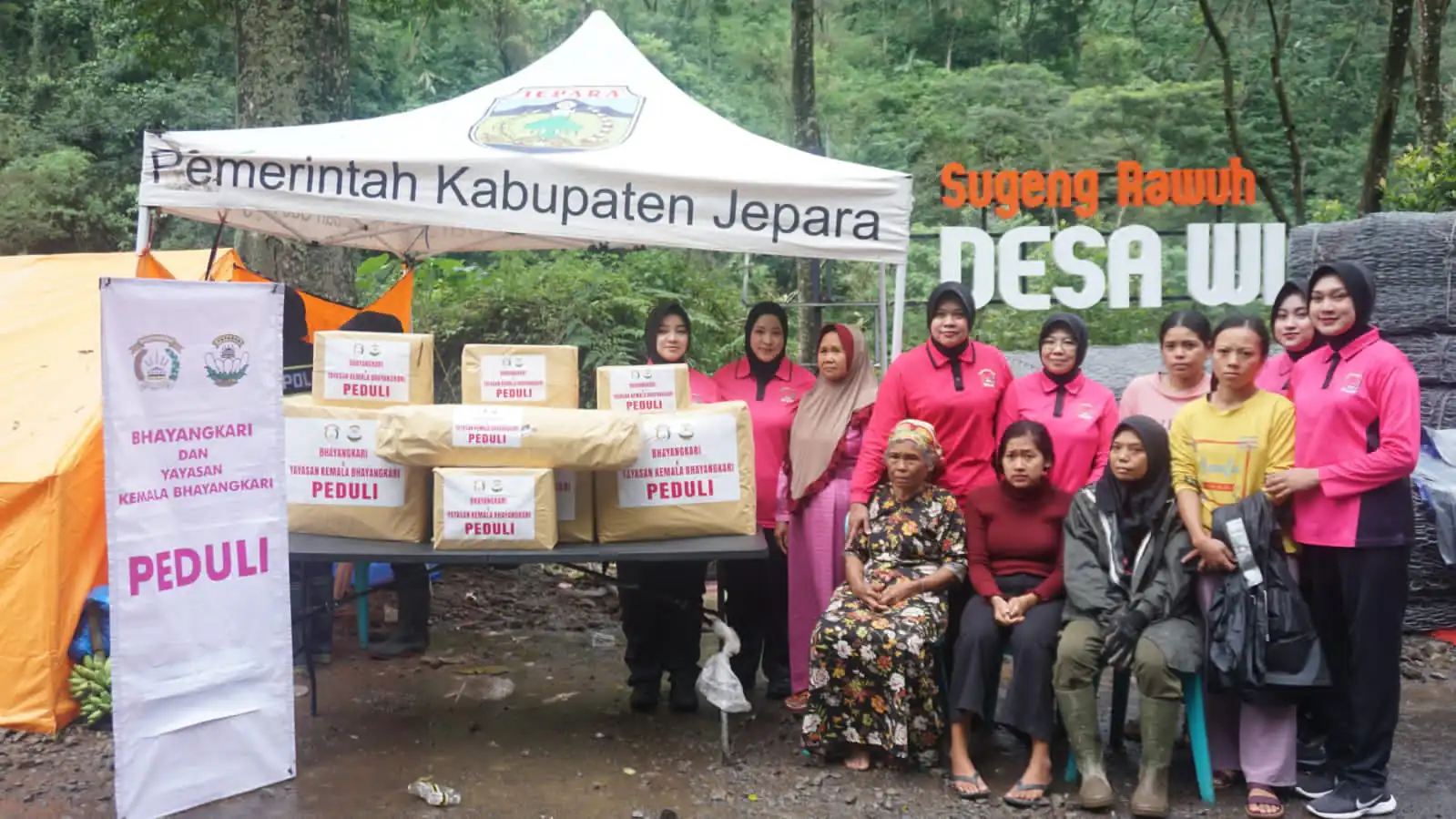 INLINK, Jepara | Kepala Kepolisian Resor (Kapolres) Jepara AKBP Hadi Kristanto bersama Ketua Bhayangkari Cabang Jepara Ny. Dian Hadi Kristanto didampingi pejabat utama Polres Jepara dan pengurus Bhayangkari menggelar kegiatan bakti sosial dengan memberikan bantuan sosial kepada warga terdampak banjir dan tanah longsor di Desa Tempur, Kecamatan Keling, Kabupaten Jepara, pada Jumat (16/1/2026).