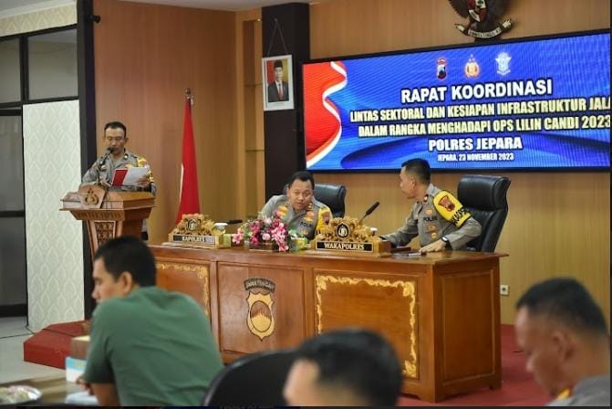 INLINK,POLRES JEPARA | Kepolisian Resor (Polres) Jepara menggelar rapat koordinasi lintas sektoral operasi lilin candi untuk pengamanan Hari Raya Natal 2023 dan Tahun Baru 2024 yang bertempat di Aula Polres Jepara, Kamis (23/11/2023).