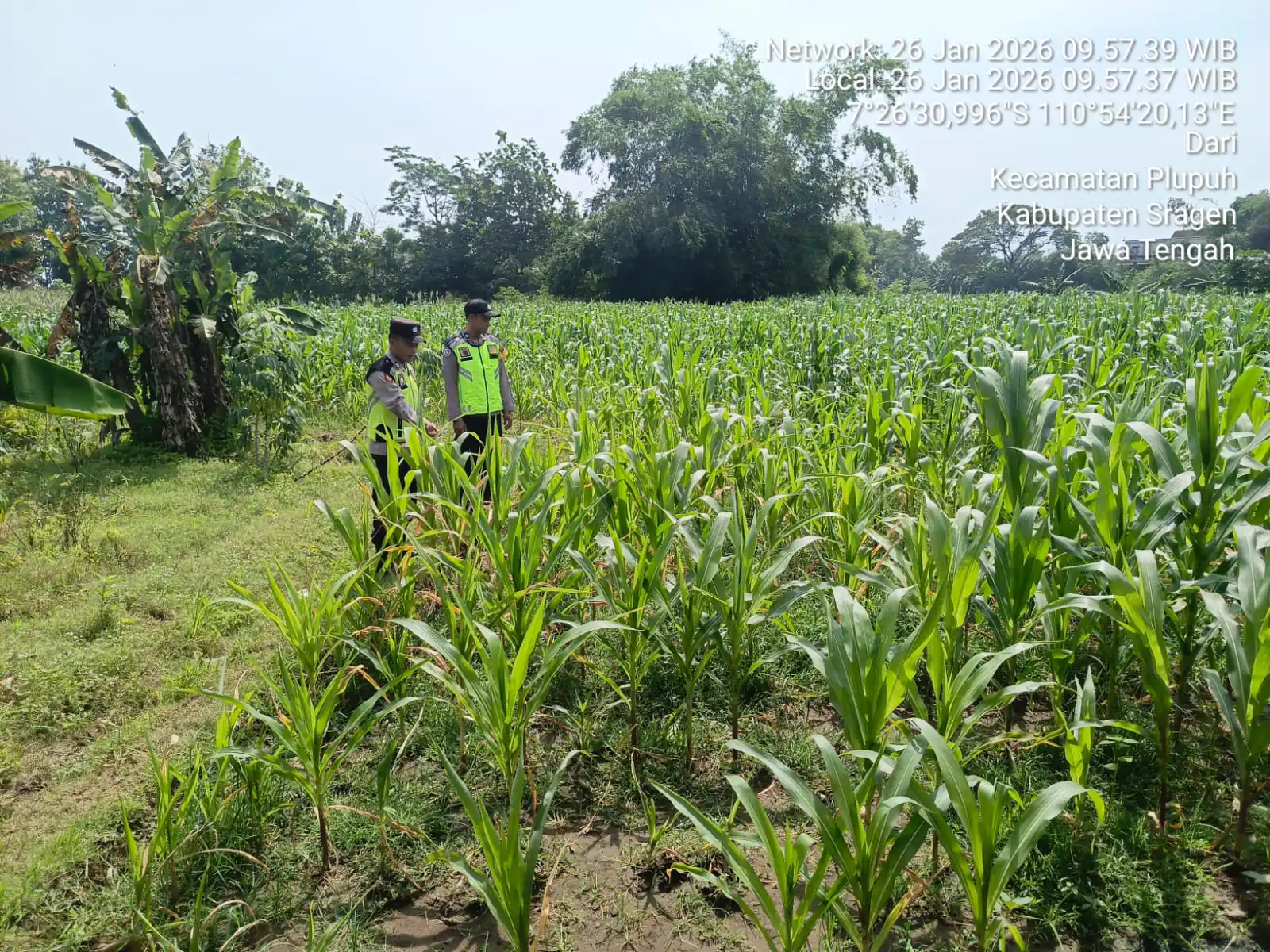 Pada Senin (26/1/2026) pukul 10.00 WIB, personel Polsek Plupuh melaksanakan pengecekan kondisi tanaman jagung di lahan persawahan milik warga Sunardi, seluas 2.500 meter persegi, yang berlokasi di Desa Dari, Kecamatan Plupuh, Kabupaten Sragen.