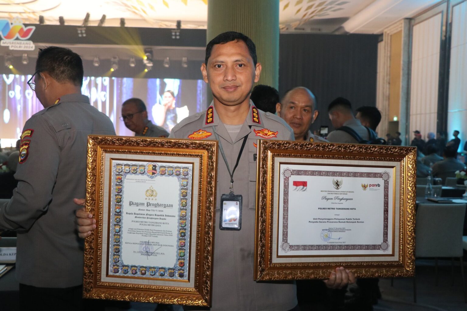 INLINK, TANGERANG — Kepolisian Resor Metro Tangerang Kota berhasil menorehkan prestasi kinerja dalam pelayanan publik. Prestasi membanggakan Kali ini, menyabet penghargaan sebagai Unit Penyelenggara Pelayanan Publik Terbaik Penyedia Sarana Prasarana Ramah Kelompok Rentan dari Kementerian Pendayagunaan Aparatur Negara dan Reformasi Birokrasi (KemenPAN-RB) RI dan Kapolri.