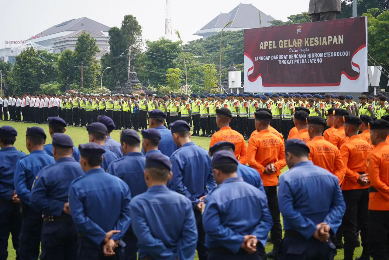 INLINK, Kota Semarang | Kepolisian Daerah (Polda) Jawa Tengah menunjukkan kesiapan penuh dalam menghadapi potensi bencana hidrometeorologi selama musim hujan. Kesiapan ini ditandai dengan digelarnya Apel Kesiapan Tanggap Darurat Bencana Hidrometeorologi Tingkat Polda Jateng yang dipimpin oleh Waka Polda Brigjen Pol Latif Usman mewakili Kapolda Jateng Irjen Pol Ribut Hari Wibowo pada Rabu pagi, 5 November 2025, di Halaman Apel Mapolda Jateng.